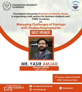 Foundation University Business Incubation Center (FUBIC), Islamabad invited Mr. Muhammad Yasir Amjad, Head Incubation (Futurizm) and Director CENTIN, UMT Lahore,